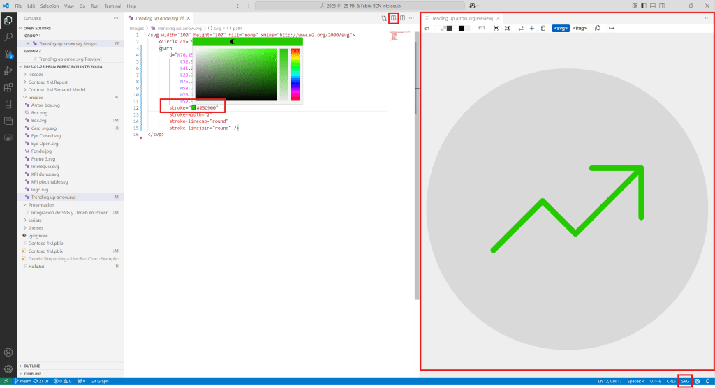 ¡Pues existe una extensión para trabajar con SVG! Y es una pasada las funcionalidades que añade, pasamos de un archivo que por defecto interpreta como un XML, a un archivo que interpreta como SVG, nos añade un botón para previsualizarlo, y incluso en el propio código nos da una idea de los colores que definen los códigos hexadecimales, y ojo, permite abrir un selector de colores para que tanteemos a ojo como cambiarlo. Todas estas cosas y más están resumidas en el vinculo hacia la extensión.